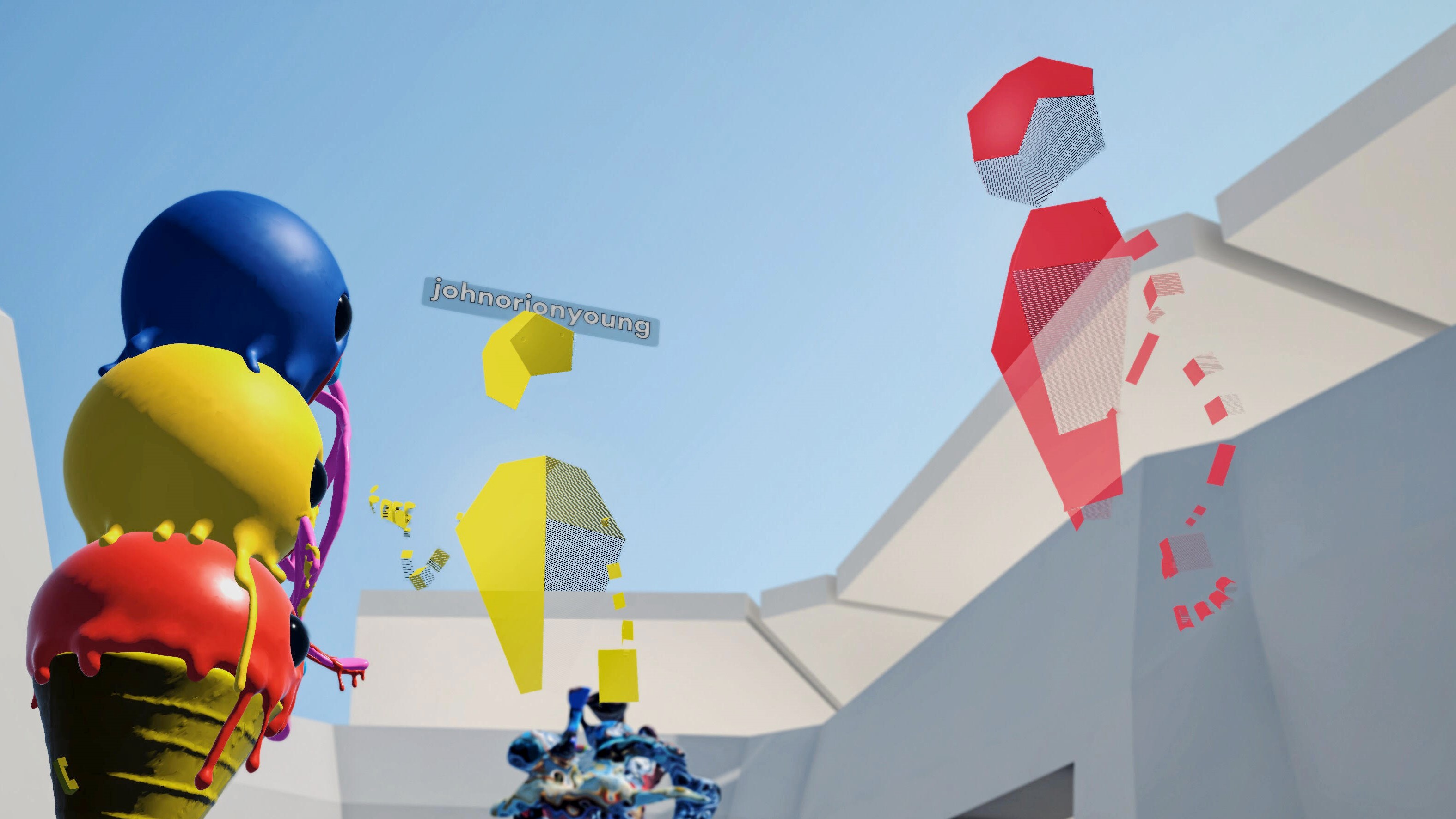 So what's the benefit of having the interviews in VR? A huge one is context. In the interview with John Orion Young, for instance, you're not watching a flat video recording, rather, you're standing in the same space with him and his art as it happens. Similarly, the Complex Chaos tour features Colin Northway talking about the technical implementation of the piece while guiding visitors through the room. In this way, the artists can refer to certain aspects of their artwork or the environment they're in, unlocking more opportunities for commentary and immersion. We're experimenting with different formats as well, with Em Halberstadt's interview being a volumetric video recording as opposed to an in-avatar recording within the MOR. This format allows visitors to actually see the artists, inclusive of their likeness and mannerisms.