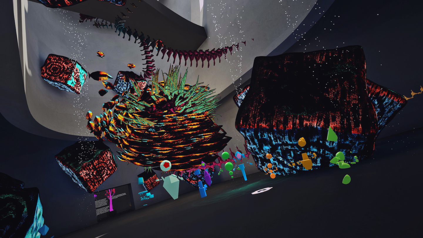 “I almost always start my design with organic sounds. So I recorded a bunch of weird stuff with some chimes and a banjo. To make it sound otherworldly. I reverse a lot of the sound out of a ton of reverb and effects. These are just looping sounds, but what you can't hear in this video is that the piece is reacting to a voice which could be both premises. But there are always technical restraints with experimental art and we weren't able to get the sound tied to that reaction. So I tried to design this with as much movement as possible.”