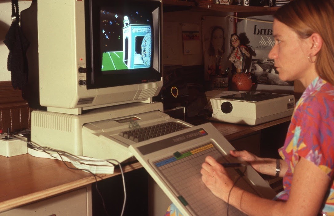 Jacki was an artist before there were computer graphics. In 1981 when she was able to buy an Apple II computer, it had a whopping 280x192 pixels to work with. For her Master’s Thesis (1981-84), she drew things onto this Apple II computer using a graphics tablet, basically a bunch of magnetic wires which weighed about 30 pounds and was fairly expensive. She borrowed it from a computer store - and they let her have it for the duration of her thesis.