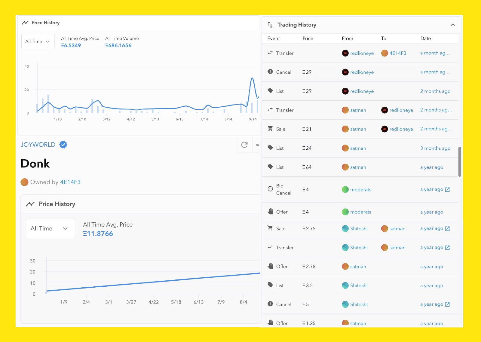 At different times, all of the JOYs collectively have been worth over a million dollars depending on what is being traded and at what rate. So it’s amazing and kind of strange that as artists we try not to think about things this way, but it is always going on, and you can see on the far right (table image) - this is just the trading history of one JOY, over time - so you can see when somebody has made an offer, and then somebody else has accepted the offer, and they then sold it and transferred it. But what we have here is a gigantic, public ledger of artwork - when it was created, who owned it, how much they paid for it, and then how much the next person had to. This is the first time in history that there are public ledgers of everything being created and where it is going.